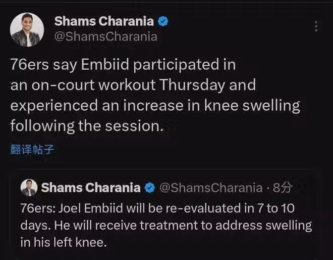 Shams&75人宣布:大帝訓練後膝蓋腫脹加劇,7到10天後重新評估。