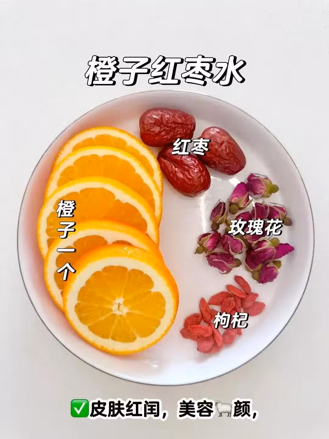 材料:橙子1個、紅棗幾顆、玫瑰花適量、枸杞適量
