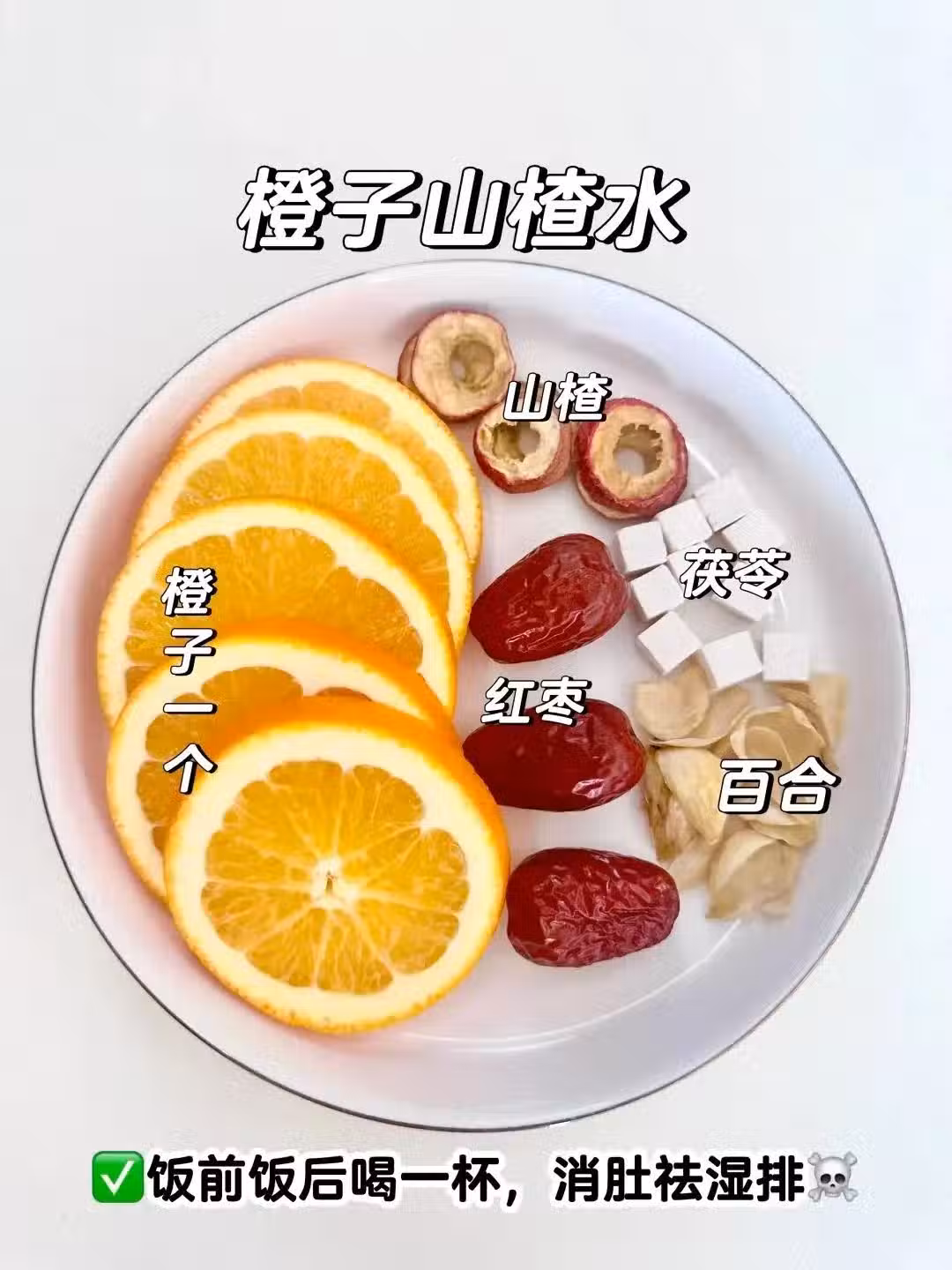 材料:橙子1個、山楂干4顆、百合適量、紅棗3顆、茯苓適量