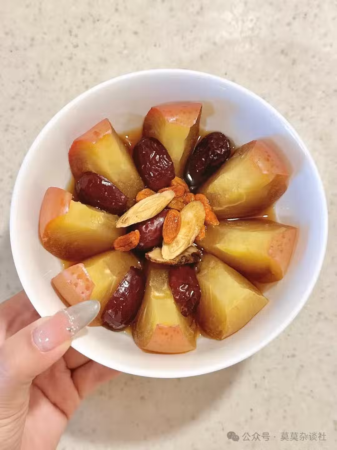 蘋果被稱為「脾之果」,熟吃更是健脾養胃的小能手!蒸過的蘋果軟糯香甜,像天然的小甜品,搭配紅棗,能滋陰養心、溫補脾胃,特別適合胃弱、消化不良的人。