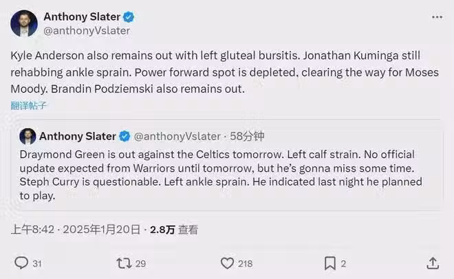 1月20日,勇士記者Anthony Slater報道,勇士4名球員缺席明天和凱爾特人的比賽:庫明加(腳踝扭傷)、波傑姆斯基(腹部傷勢)、安德森(左臀滑囊炎)、追夢格林(左小腿拉傷)。庫里左腳踝扭傷,明日出戰成疑。