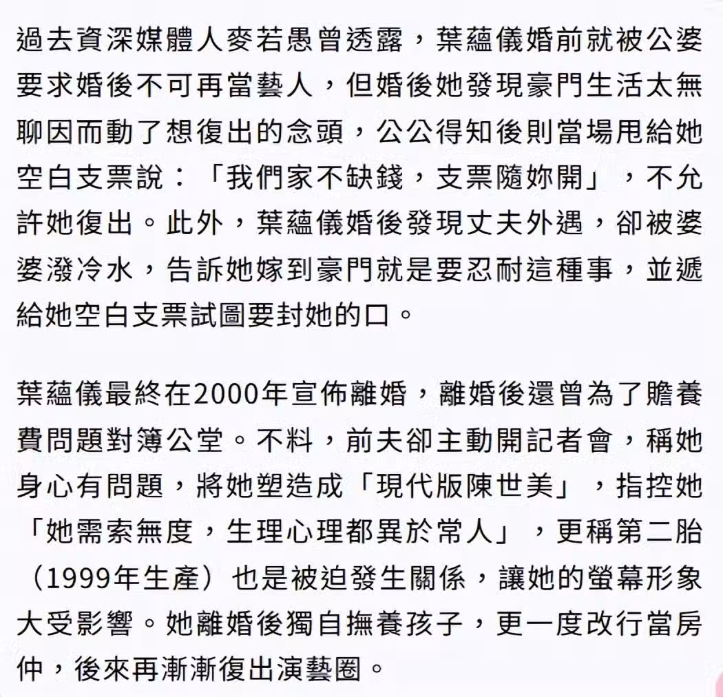 媒體人將葉蘊儀描述成貪錢、性慾強的拜金女,對她的形象造成很大的負面影響,葉蘊儀最終發聲否認,而且直接怒撕前夫,忍受謠言25年才爆發,如果內容屬實,那也太慘了吧。
