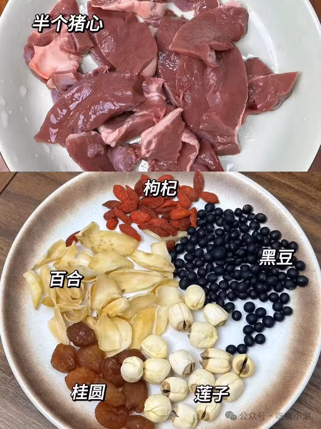 桂圓 10 顆,蓮子 20 克,黑豆 20 克,百合 20 克,適量枸杞,豬心半個,一小片姜。
