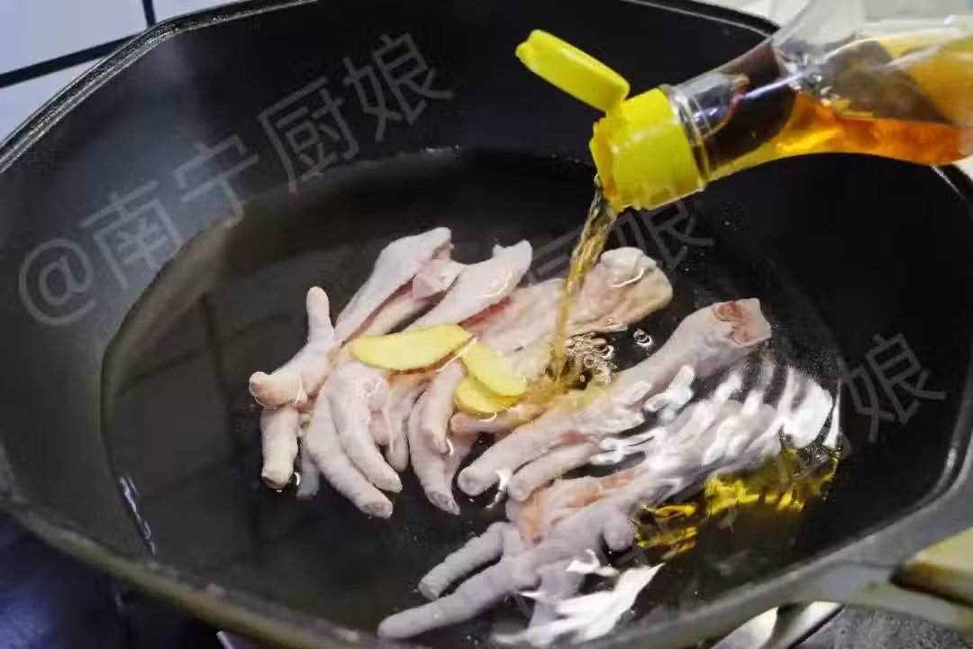 起鍋倒入半鍋清水,加入雞腳和薑片,再倒入1勺料酒,開大火燒沸。