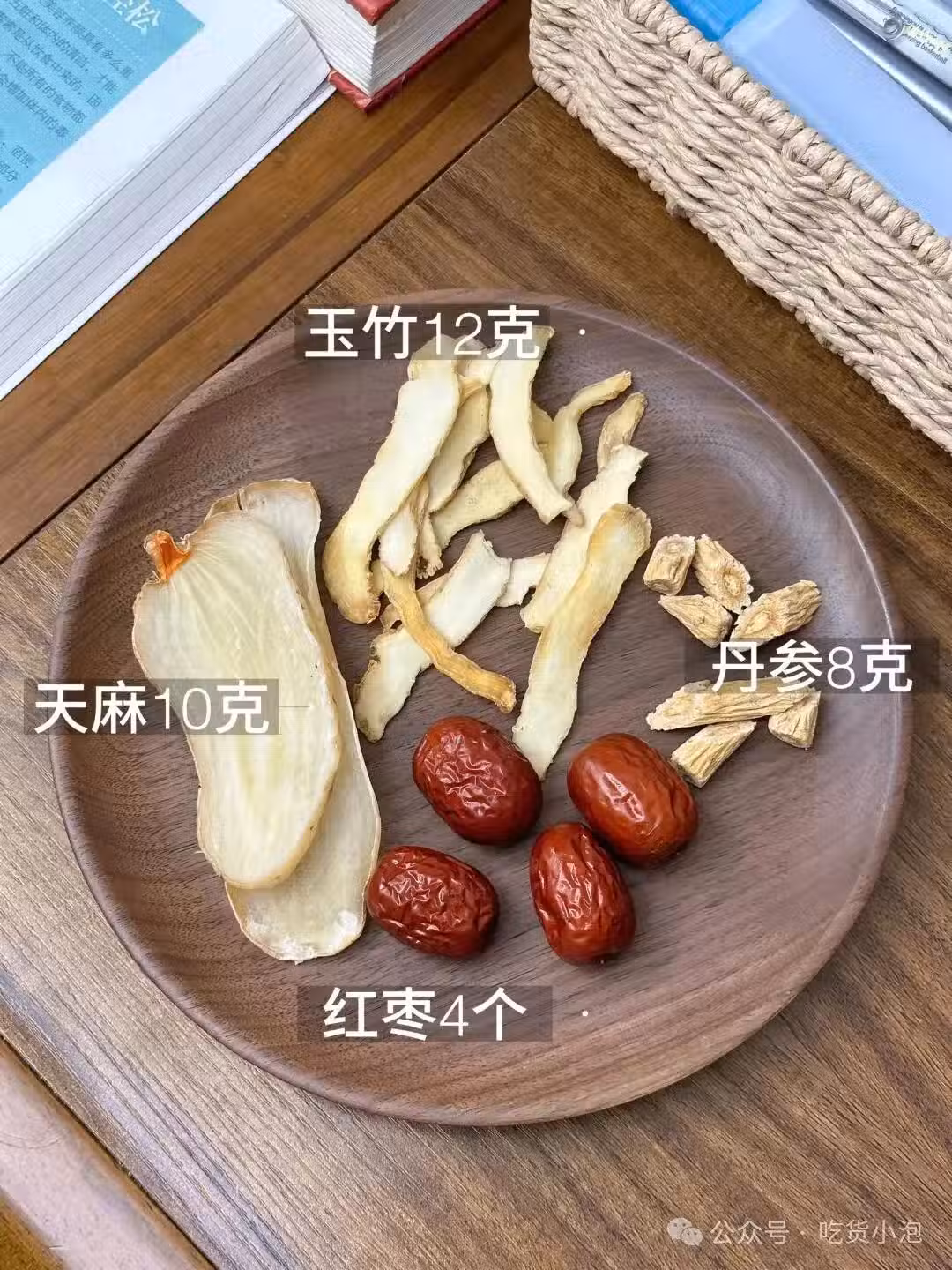 天麻 10g、黨參 8g、玉竹 12g、紅棗 4 個、適量肉類。