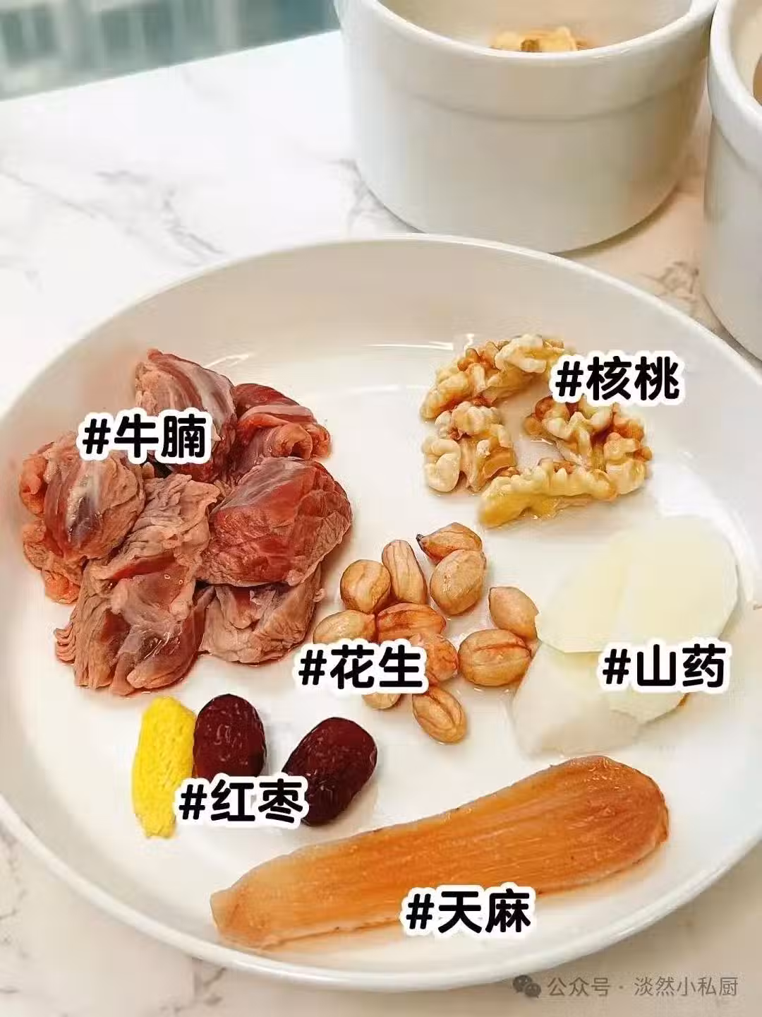 食材:天麻5克、干杏仁2顆、花生10克、鮮山藥適量、牛腩100克、紅棗2顆、枸杞適量 做法:見下圖 天麻對三叉神經痛、血管神經性頭痛、腦血管病頭痛、中毒性多發性神經炎等有明顯的鎮痛效果,天麻可治療神經衰弱的病人,有效率分別為89.44%和86.87%。還能抑制咖啡因所致的中樞興奮作用,加強戊巴比妥納的睡眠時間效應。 天麻能治療高血壓。久服可平肝益氣、利腰膝、強筋骨,還可增加外周及冠狀動脈血流量,對心臟有保護作用。 核桃含有豐富的亞油酸及DHA,是大腦和視覺功能發育所必需的營養成分;其含有的微量元素鋅、錳等都是大腦中腦垂體的重要成分。經常食用核桃能夠補充大腦所需的營養,起到健腦益智的作用。 核桃中含有相當多的褪黑激素,能夠幫助人體入眠。褪黑激素是一種能夠幫助調節人體睡眠的激素,它會在晚上進行較多的分泌以幫助人進入睡眠。
