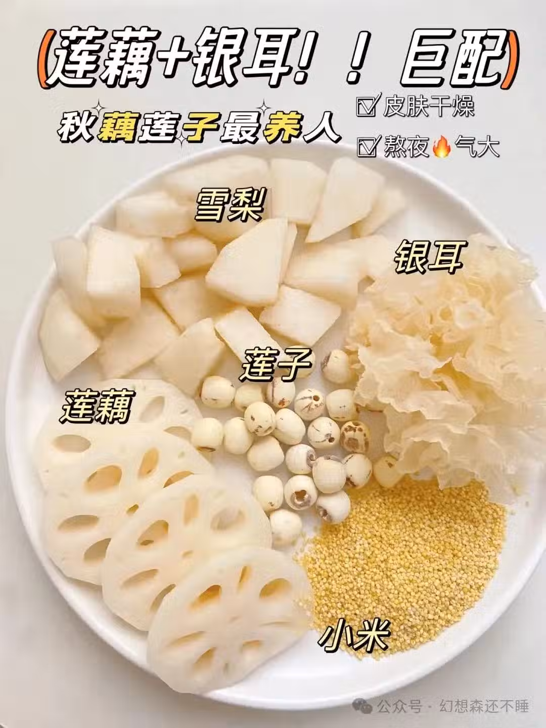 蓮藕半節、雪梨半個、銀耳 1/4 朵、蓮子一小把、小米 20 克左右