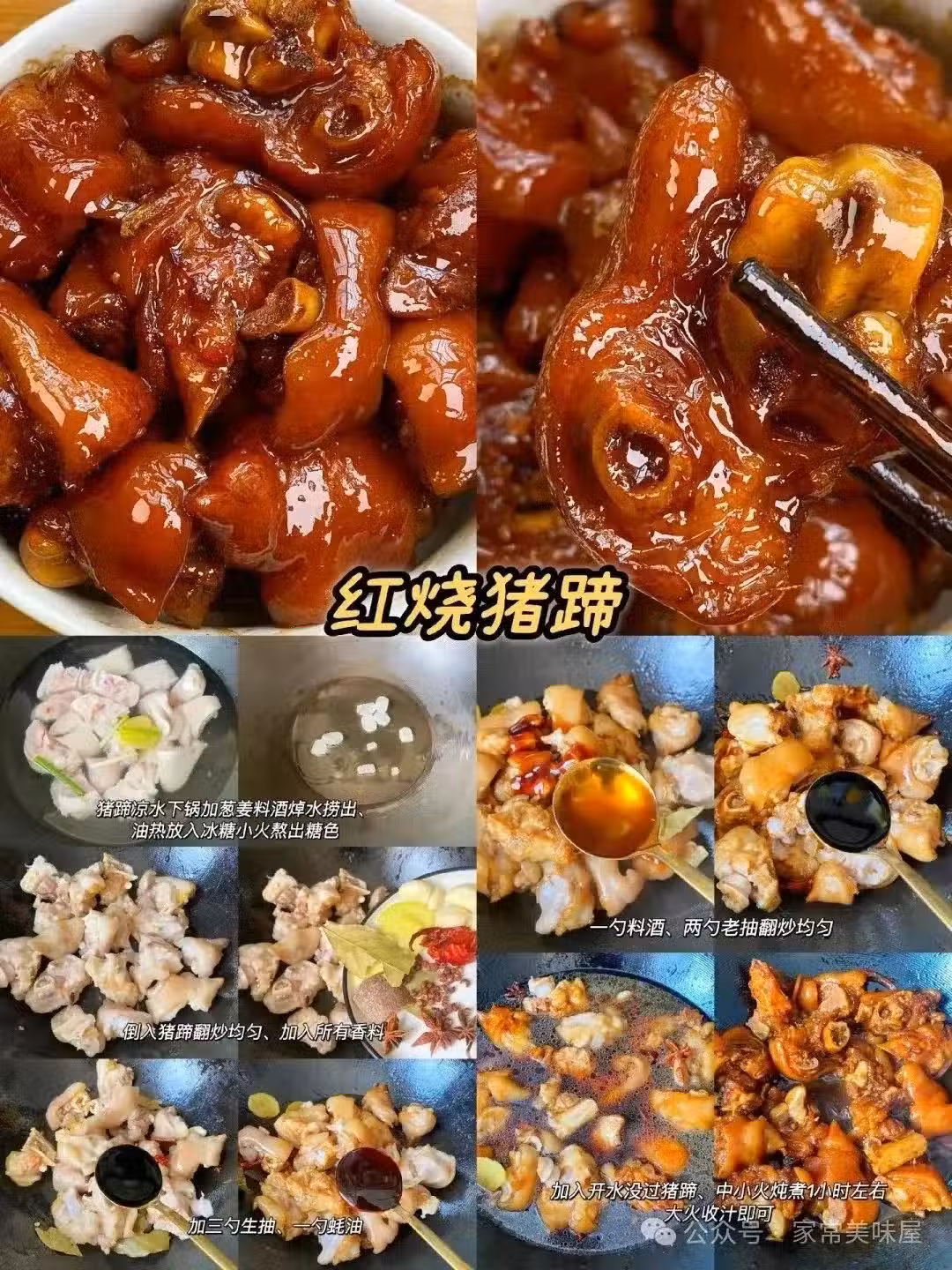 食材:豬蹄2隻、生抽1勺、老抽1勺、糖1勺、姜3片、八角2顆、香葉適量。