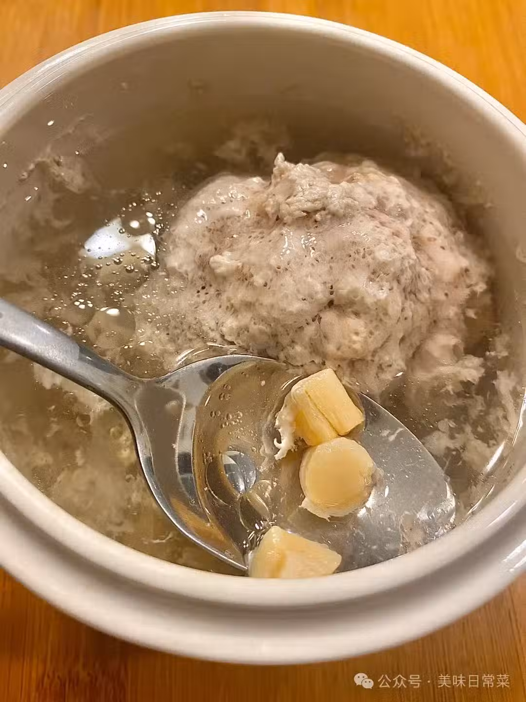 2.把瘦肉剁成肉末,搓成一個個小肉球,放進燉盅里。往燉盅里倒上溫水,再泡 20 分鐘,把瘦肉里的營養都泡出來。