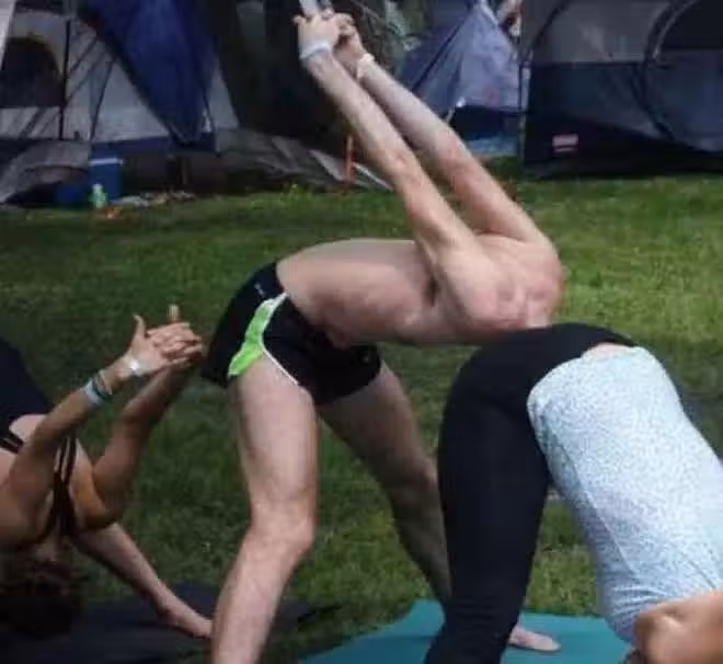 這真是一張令人感到尷尬萬分的照片。一群人正在做健身運動,其中第二位男士頭部的位置經過錯位的拍照,有些讓人難以描述。