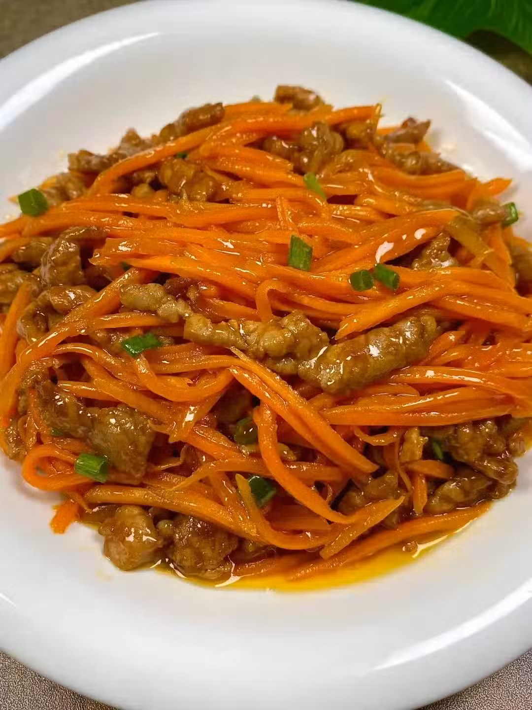 2.油熱牛肉炒熟,倒入胡蘿蔔絲炒至斷生