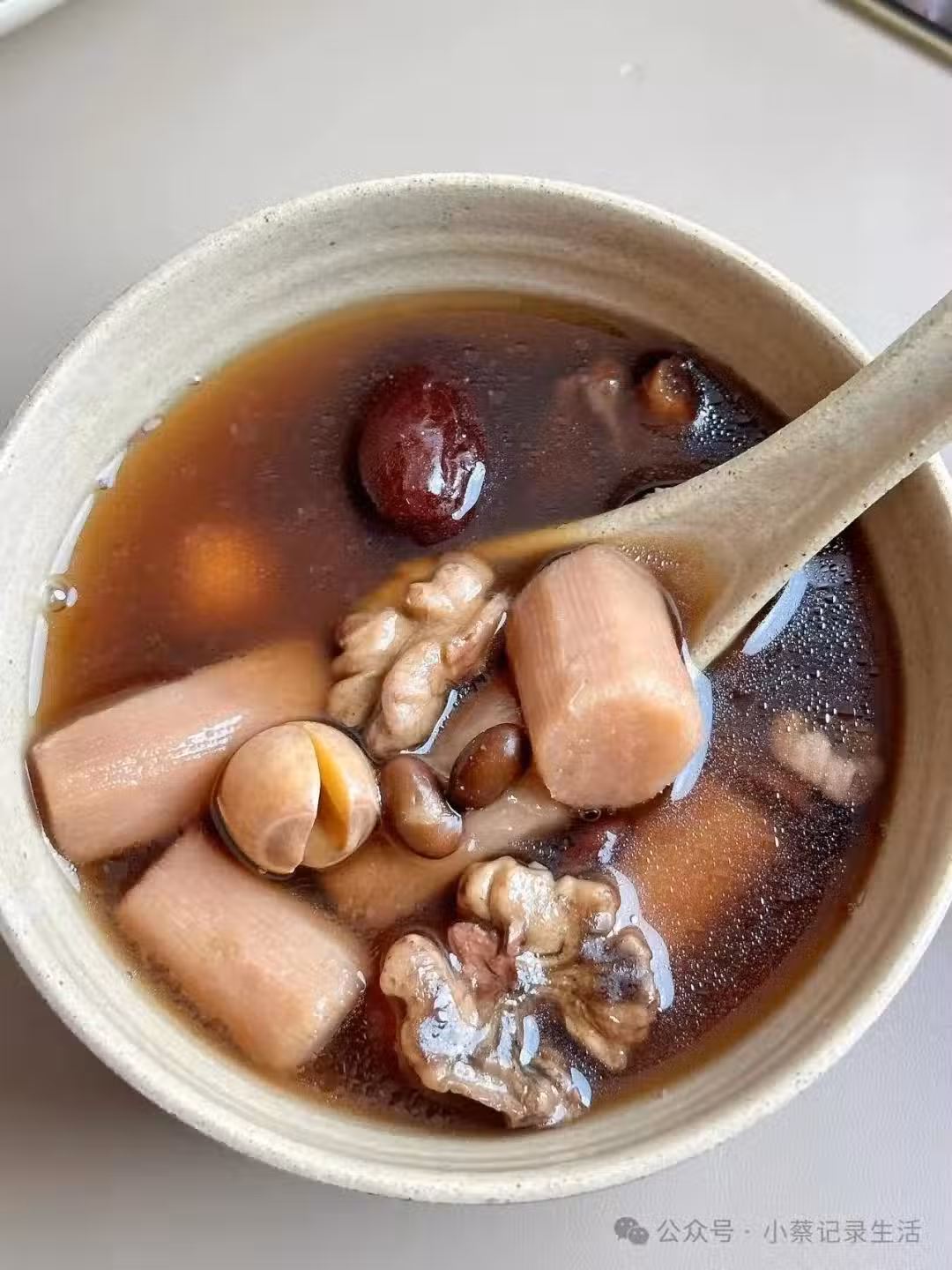 如果你壓力大,經常熬夜,用腦過度,那就得多喝這個湯啦。腎氣不夠的話,得趕緊補補!這個湯里有山藥、黑豆和核桃,都是補腎的好東西,核桃還能補腦呢。家裡的老人孩子喝了都挺好,營養很足,又不會上火。