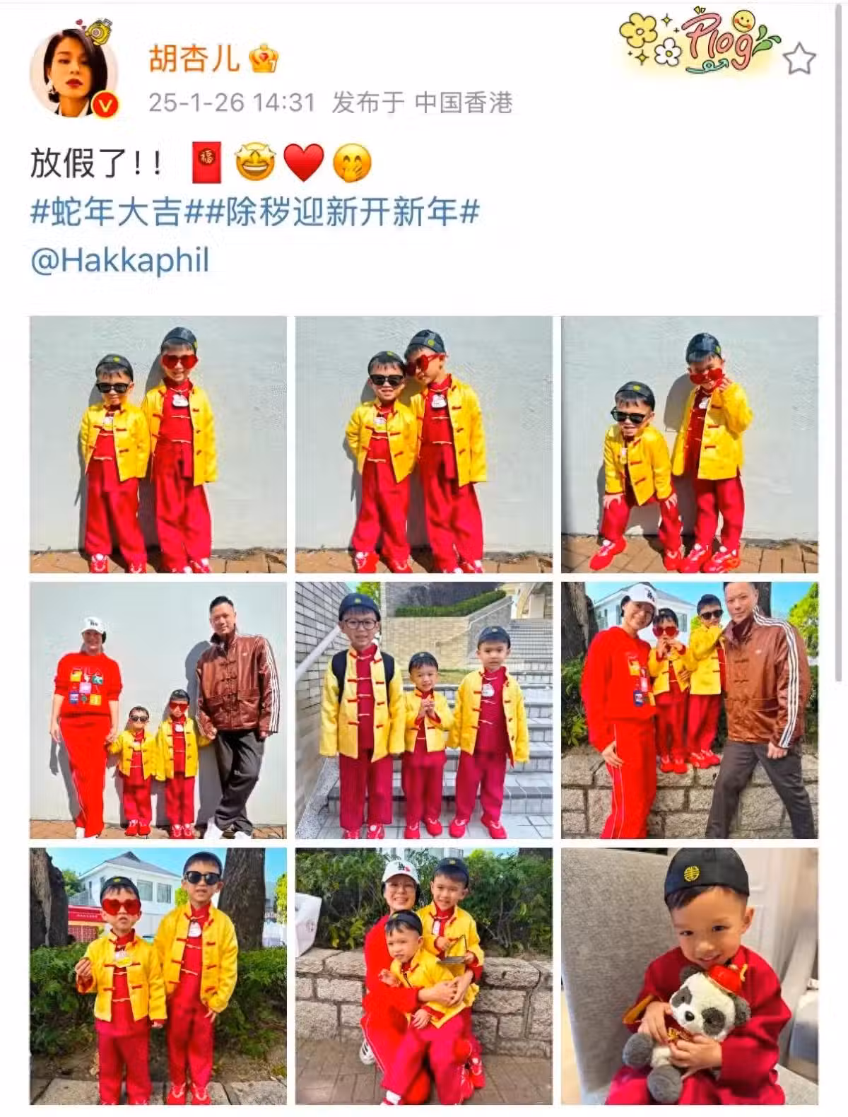 1月26日,胡杏兒在社交平台曬出一家五口放假迎新年的照片,三個兒子穿同款新年唐裝出鏡,盡顯春節氛圍。