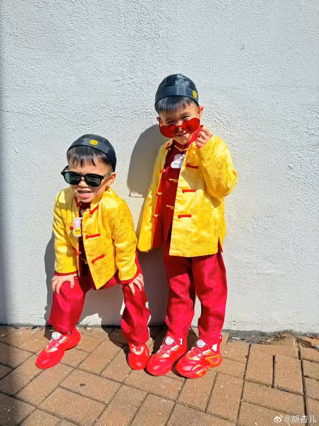 胡杏兒一家五口迎新年,三個兒子穿唐裝帥氣可愛,模樣似複製粘貼