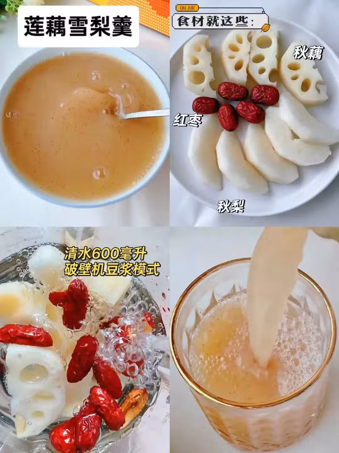 蓮藕雪梨洗凈切塊,紅棗去核一起放入破壁機,加600ml清水,豆漿模式即可。補水養顏,太滋潤了!