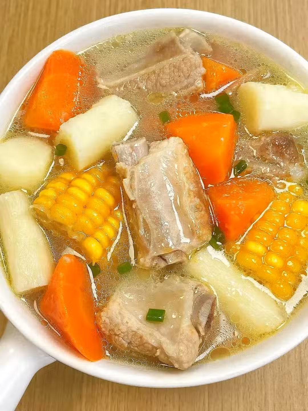 【材料】:排骨、玉米、山藥、胡蘿蔔、蔥姜