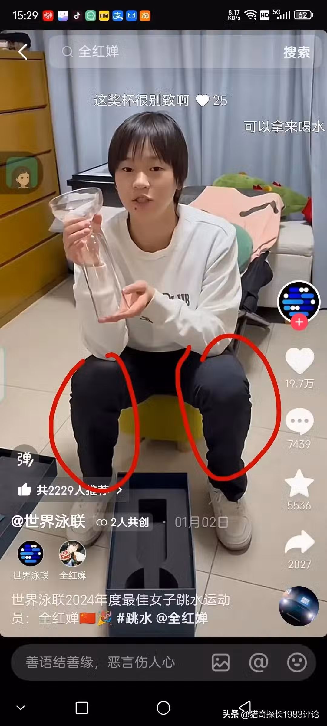 但是4個多月過去了,全紅嬋的減肥效果並不明顯,從上圖可以看到,她坐在凳子上領取了從海外寄來的2024國際泳聯最佳跳水運動員的獎盃,但是褲子卻被繃得緊緊的明顯是不合身,不知道是穿了面孔,還是身體發福的原因。
