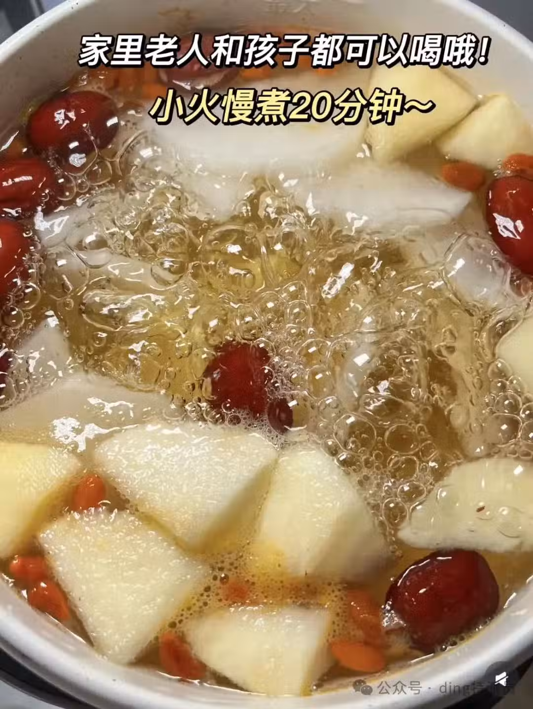 白蘿蔔具有行氣化痰的功效,雪梨則能潤肺涼心、消痰去火,兩者結合對於咳嗽、痰多的人群有很好的止咳化痰效果,白蘿蔔和雪梨都含有膳食纖維等物質,能夠促進腸道蠕動、幫助消化,從而起到潤腸通便的作用。梨性寒,有養陰清熱、生津潤燥的功效,對於上火引起的咽喉腫痛等症狀有一定的緩解作用 【食材】 白蘿蔔 紅棗 枸杞 梨 【做法】