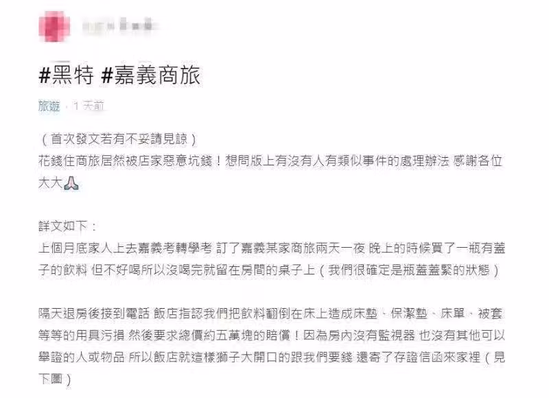 原PO接著表示,由於房間內並沒有監視器,所以飯店無法拿出可以舉證的人或物品,卻依舊獅子大開口地要錢,讓他們感到相當無奈,「我們也沒有更好的方法,找律師的話費用加起來應該會比賠償費還高,難道我們就只能這樣無緣無故被店家騙錢嗎了嗎?」
