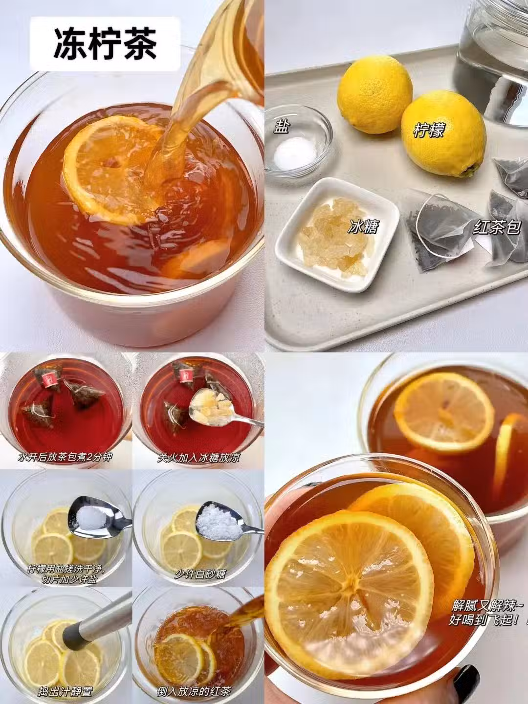 2. 檸檬用鹽搓洗乾淨後切片,切片後再加點鹽、少許白砂糖,搗出汁水,倒入放涼的紅茶,放到冰箱冷藏過後更好喝。