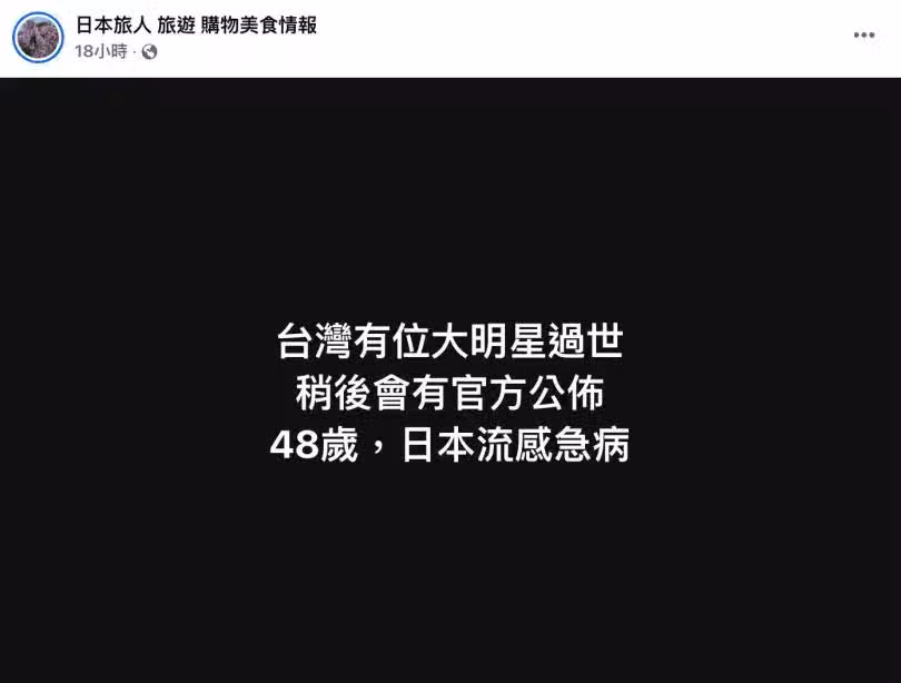 粉專宣稱台灣48歲已婚女星過世。(圖/日本旅人 旅遊 購物美食情報臉書)