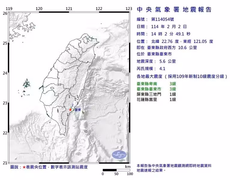 ▲2/2初五下午2時2分,台東發生規模4.1地震,最大震度3級。(圖/中央氣象署提供)