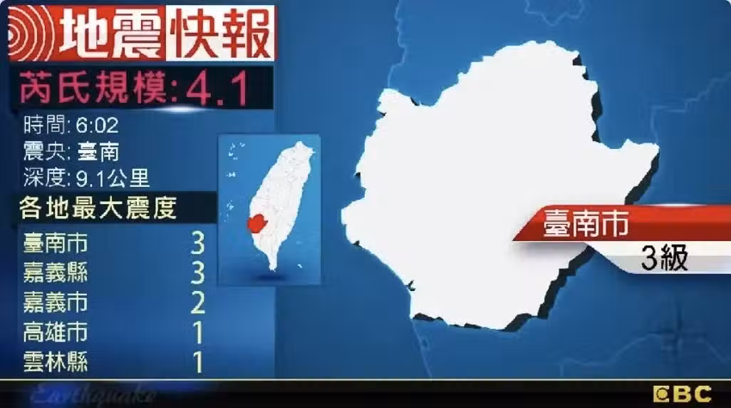 中央氣象署發布第114054號地震報告,台東今天下午2時2分發生規模4.1地震,震央即在台東縣政府西方10.6公里,位於台東縣台東市,地震深度5.6公里。