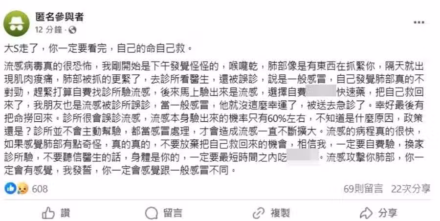 原PO說,流感的病程真的很快,「如果感覺肺部有點奇怪,真的真的,不要放棄把自己救回來的機會,相信我,一定要自費驗,換家診所驗」,同時也要在最短的時間內吃藥,「流感攻擊你肺部,你一定會有感覺,我發誓,你一定會感覺跟一般感冒不同」。