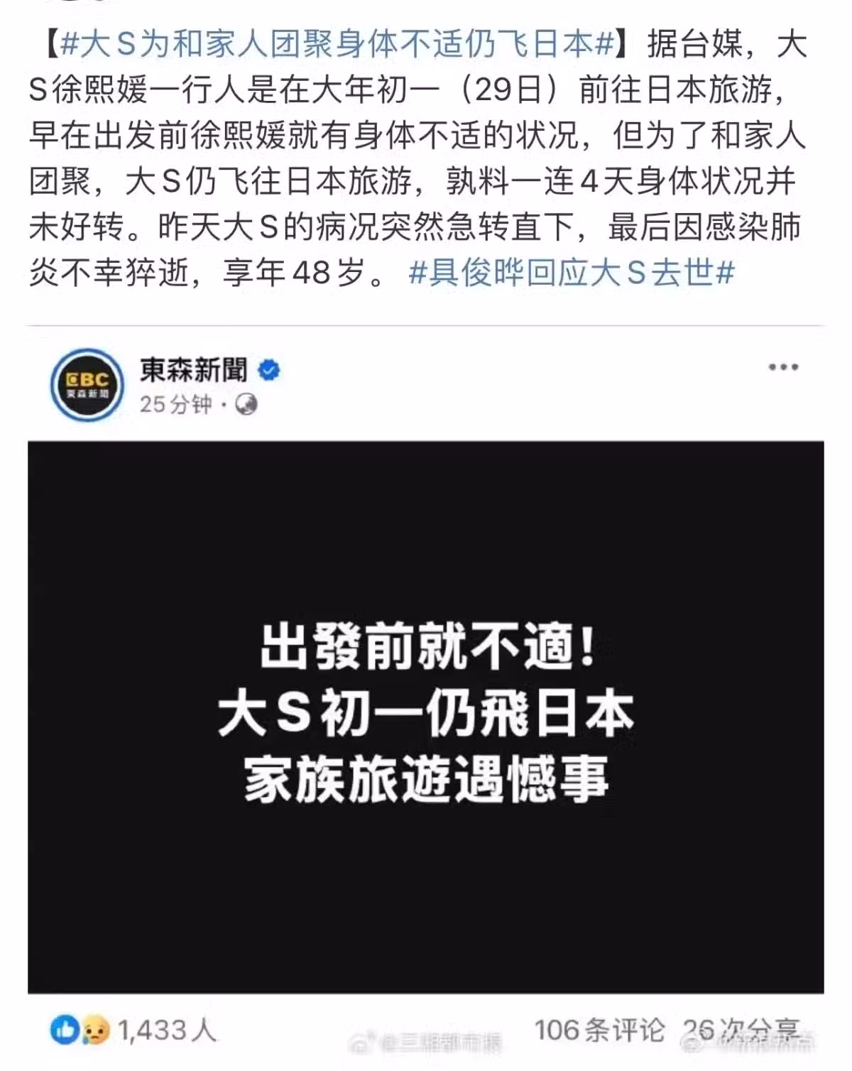 隨即,台媒也披露了大S臨終時的細節,稱她丈夫具俊曄,兩個孩子,她媽媽,以及小S一家人都陪伴在她身邊,一家人哭到無法言語,完全沒想到送去醫院時她就這樣離開了。據說現場哭聲此起彼伏,場面十分悲戚。