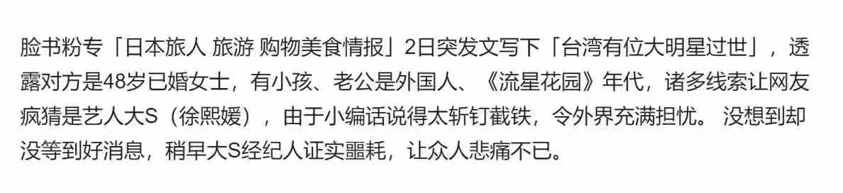 到了今天,有疑似知情的日本網友,詳細講述了大S患病的細節。