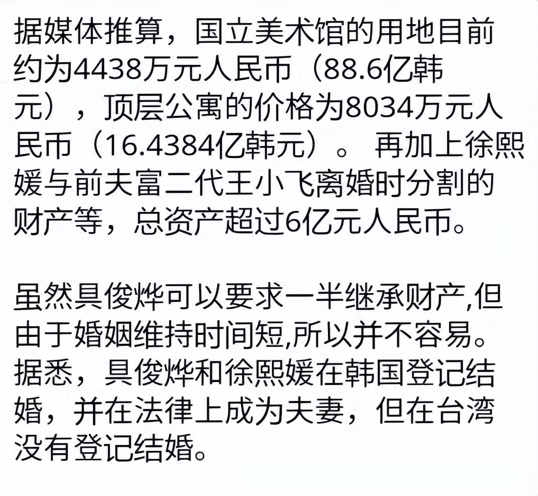 報道中指出,如果大S立有遺囑,會按照遺囑分配,但如果沒有立遺囑,具俊曄和兩個孩子會分得三分之一的遺產,不過小孩不是具俊曄親生,因此遺產份額和撫養權可能歸汪小菲。