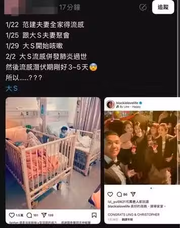 但也有網友出面還原時間軸,認為這次的流感意外,說不定是「可以避免」的,因為按照時間順序,以及前陣子一同參與王偉忠女兒婚禮的人員來推測,癥結點很可能出現在大S的「藝人夫妻好友」身上,而他們的身份也被曝光了。