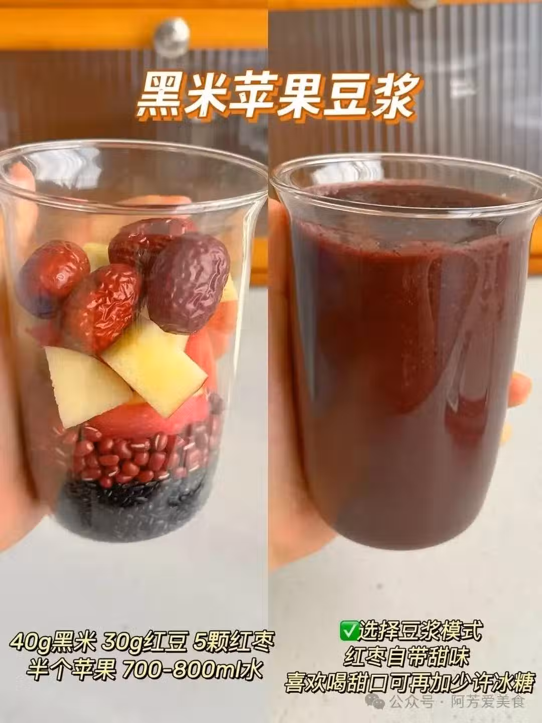 黑米蘋果豆漿,不僅融合了紅豆,還有蘋果的香甜氣息,口感喝起來是不膩的,還有蘋果的香氣,紅棗的甜味已經足夠了,可以不需要再加入冰糖!如果喜歡喝更甜的朋友們可以適當的加一些噢!