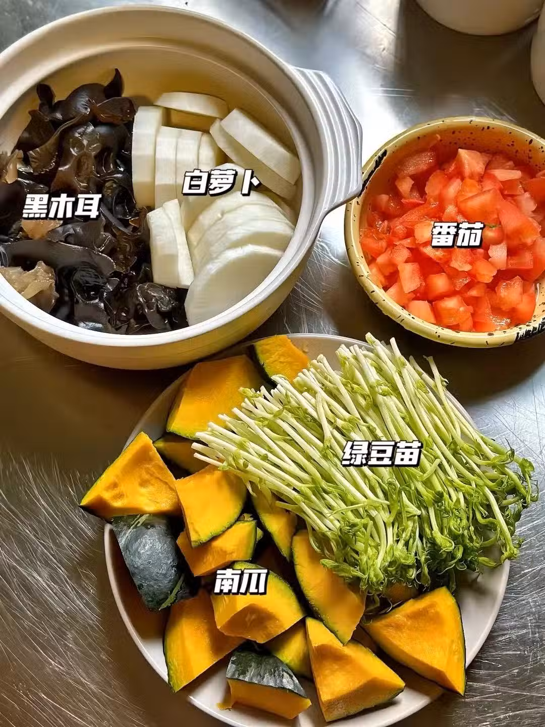 2️⃣加入適量的水,放入白蘿蔔煮10分鐘,下黑木耳煮5分鐘,最後下豆苗煮2分鐘,出鍋加鹽調味即可;