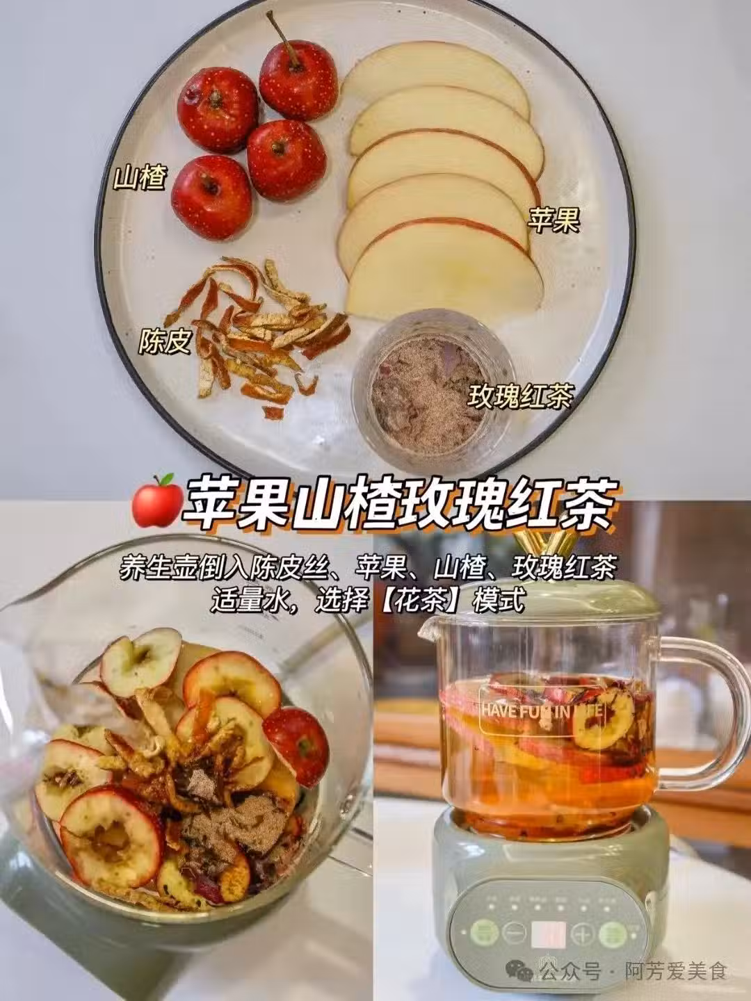 蘋果山楂玫瑰紅茶,山楂酸酸甜甜的在搭配蘋果還有玫瑰的花香再加入紅茶,簡直是非常的清爽又解膩,很多朋友們喜歡喝這一款。