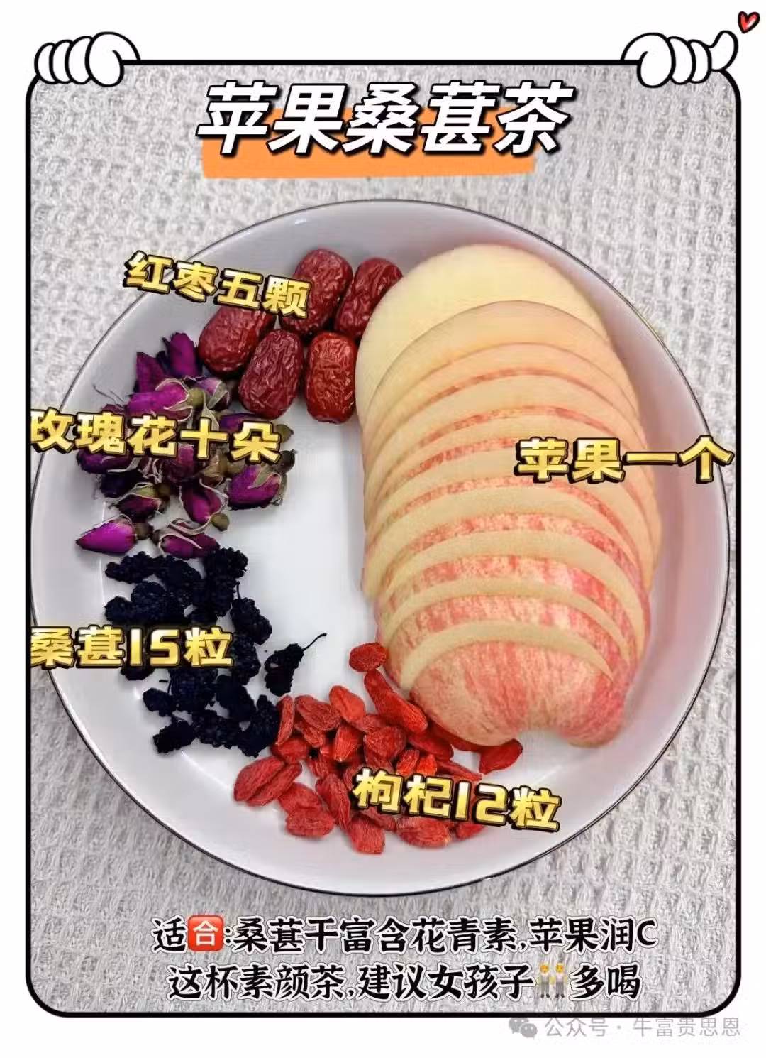 蘋果富含多種維生素與膳食纖維,香甜可口;桑葚干含有豐富的花青素等營養成分;紅棗能補氣養血;玫瑰花可疏肝理氣、美容養顏;枸杞滋補肝腎。多種食材搭配,使茶飲口感豐富,營養全面。