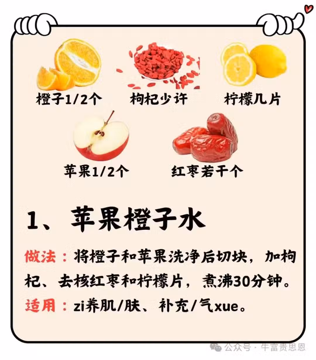 橙子1/2個、枸杞少許、檸檬幾片、蘋果1/2個、紅棗若干個