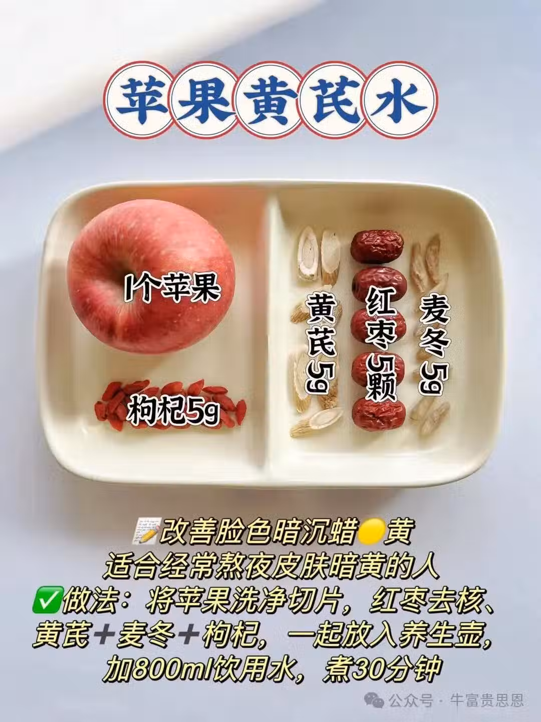 蘋果1個、黃芪10克,枸杞5克,紅棗5克,麥冬5克。