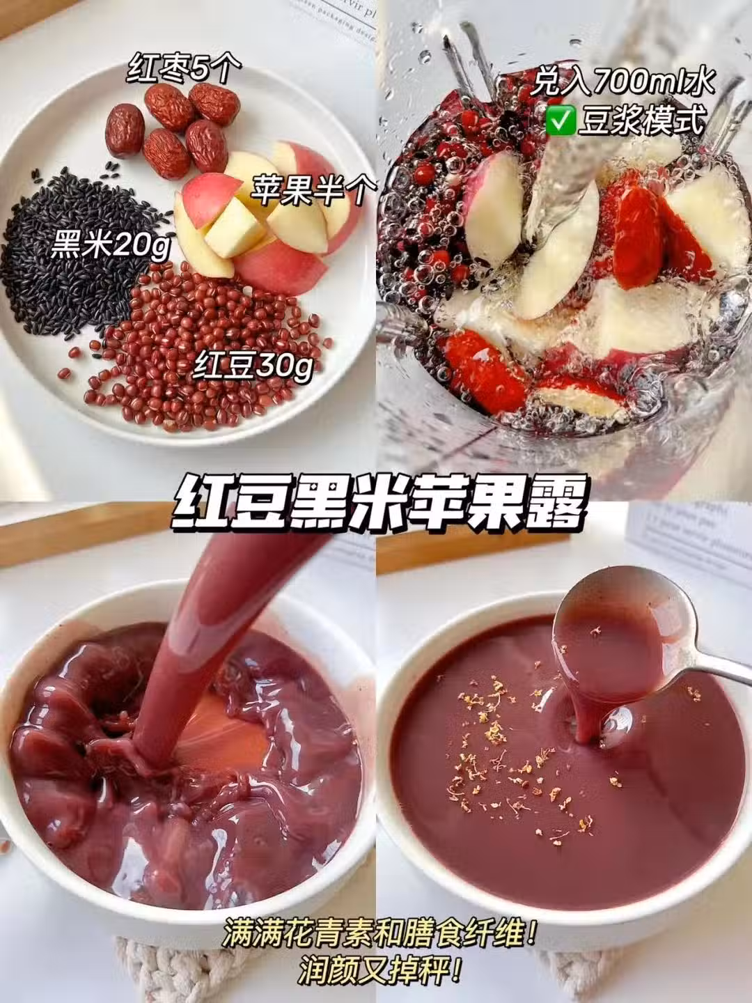 滿滿花青素和膳食纖維!潤顏又掉秤!紅豆:滋潤養fu.自帶腮紅~黑米:富含豐富花青素,抗氧抗老~蘋果:富含膳食纖維,幫助通便,都是對女孩子超好的養fu配方! 6️⃣濃香黑芝麻糊 ☑️食材:紅棗3顆、黑芝麻60g、核桃3塊、冰糖幾顆、糯米25g