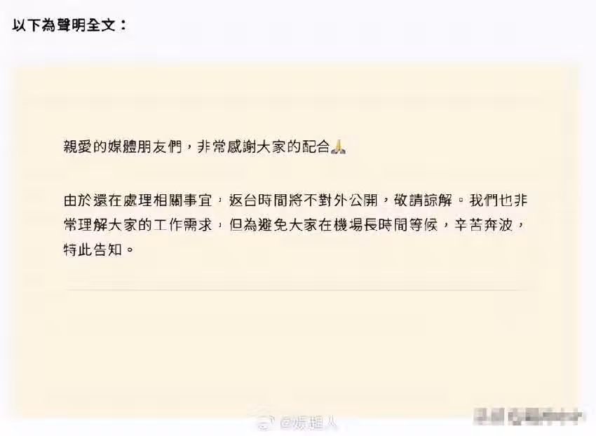 另一邊,面對眾多媒體的等待,小S也二次發聲,表示返台時間將不對外公開,「由於還在處理相關事宜,返台時間將不對外公開,敬請諒解。