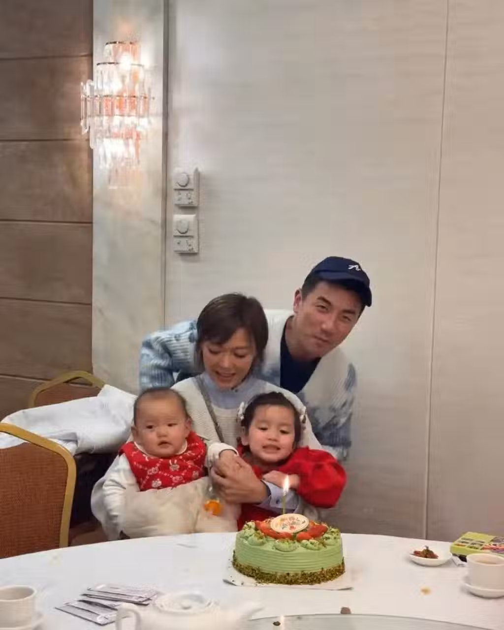 被小舅子霸著老婆的洪永城也不甘示弱。立馬抱上兩個可愛的女兒與老婆面貼面合照。除了兩個不懂事的女兒目光呆滯,夫妻二人從照片中都可以感受到他們的幸福快樂。
