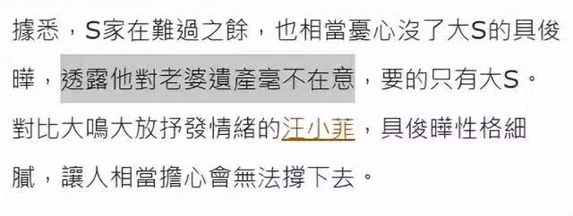 事實上,韓媒一天前就爆料,大S留下大約6億人民幣的財產,作為丈夫的具俊曄原本享受一半的分配權,但兩人並沒有在中國台灣註冊,所以難度很大,而且如果有婚前協議的話,具俊曄只能分到結婚3年內所獲得的夫妻財產,其實也沒多少,畢竟大S婚後沒怎麼工作。