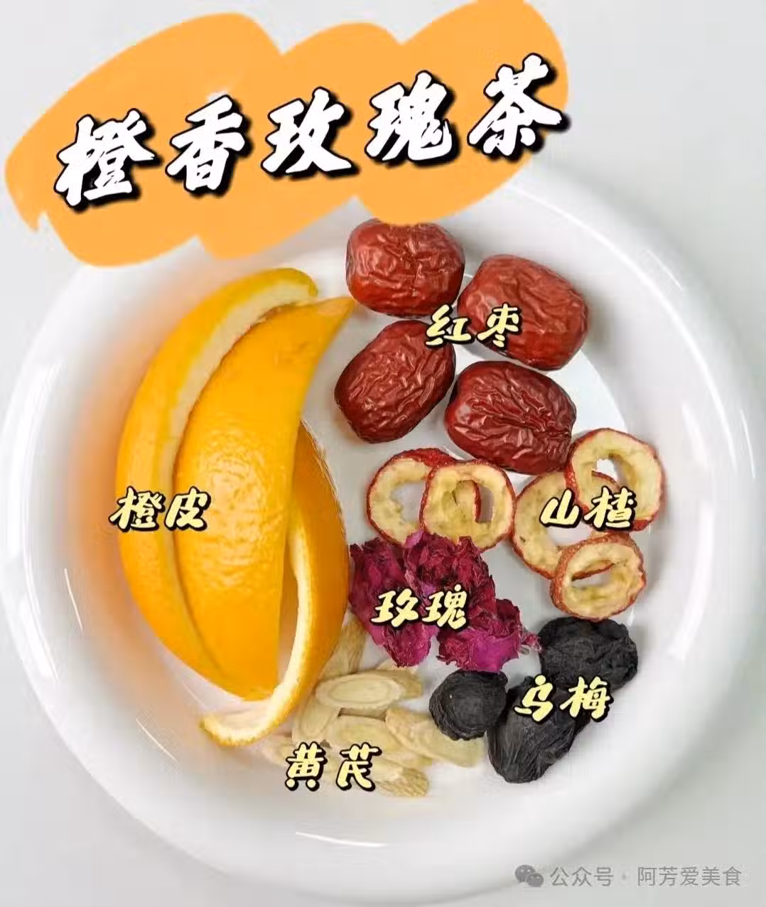 橙皮玫瑰茶,陳皮和玫瑰的花香味融合得非常的好,準備的味道是很獨特的,喝茶不僅有橙子酸甜的香氣,還有玫瑰花香的甜野。