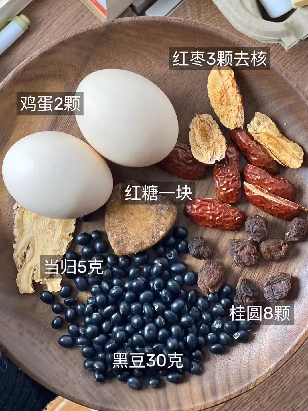 🥗食材準備:當歸5g、雞蛋2個、黑豆30g、去核紅棗3顆、桂圓乾8顆、紅糖1塊