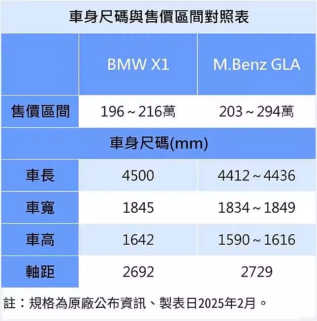 兩車差異最明顯的是價格帶,GLA價格區間拉到294萬元,主要是因為有GLA 35 AMG車型所致,目前X1並無相應性能車型,如果只單獨羅列GLA180、GLA200兩款主力販售車款,價格帶就會是203~222萬元,在主力販售車型部分仍是完全對上。