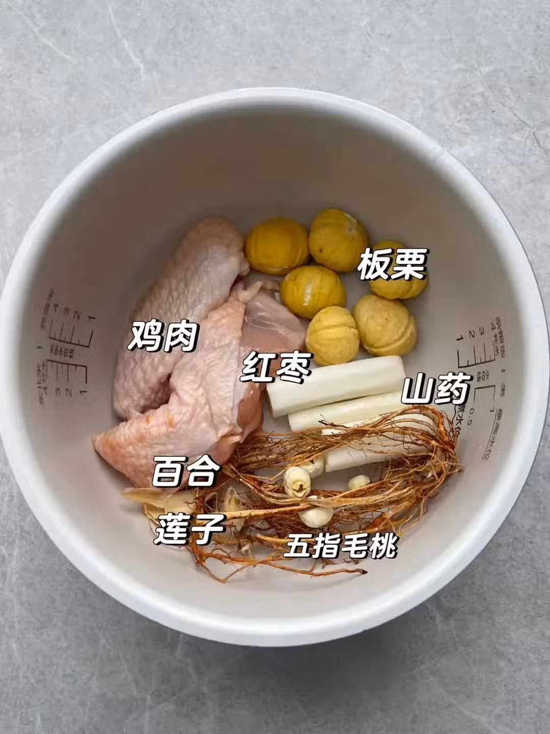 🉐做法:雞肉焯水後,加入五指毛桃,山藥,板栗,蓮子,百合,紅棗,一起煲一小時,出鍋加鹽調味即可