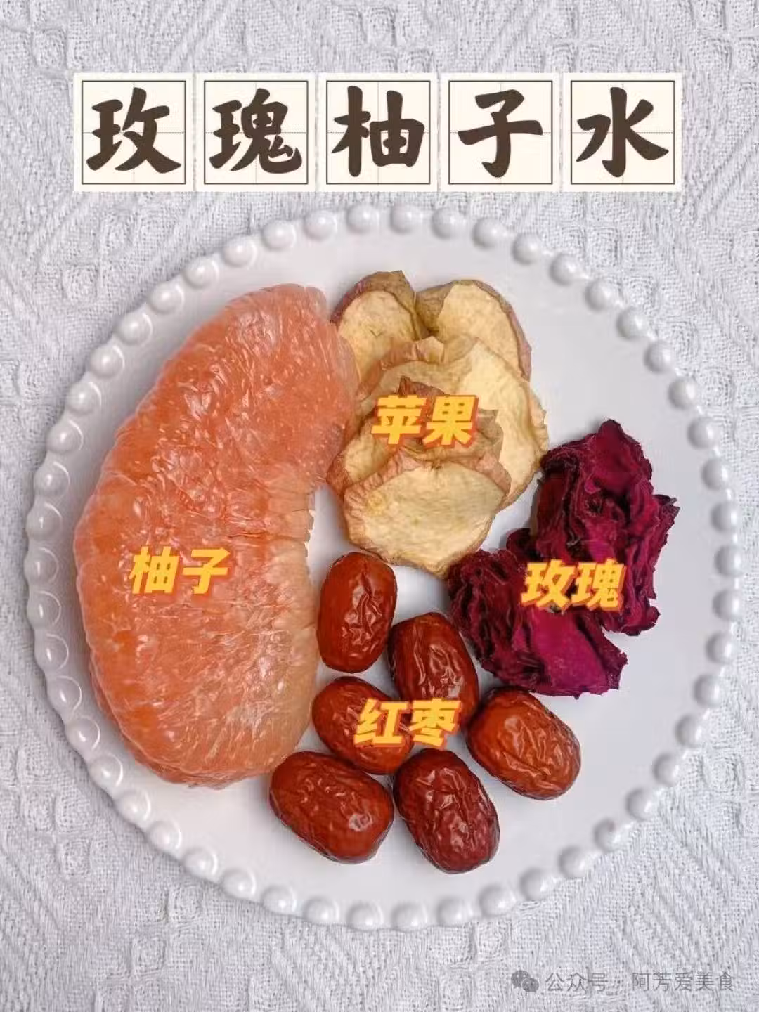 玫瑰柚子水,柚子和蘋果的清爽口感加入了玫瑰口感上更加的豐富,不僅好喝又非常的香,紅棗記得要去核,可以更加的入味。