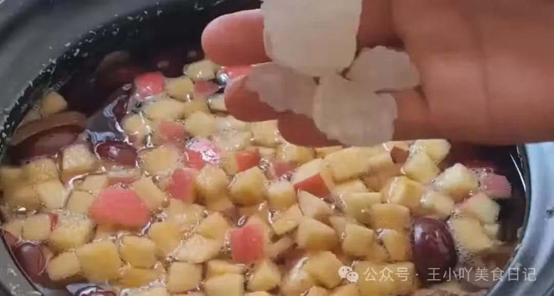 加入蘋果與冰糖:當鍋中的蓮子與紅棗煮制至軟糯時,打開鍋蓋,將切好的蘋果丁加入鍋中,同時放入適量的冰糖。冰糖的加入不僅能中和口感,還能增添湯品的甜味,使其更加美味可口。