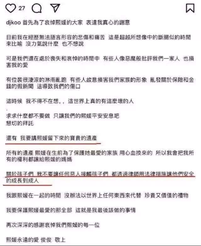 說會把自己的權利讓給丈母娘,還表示會守護大S的倆孩子,並通過法律措施讓他們安全成長到成年,不會讓任何壞人搶走。
