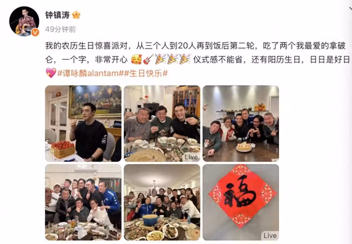 雖然春節假期已經結束,但是按照傳統,只要沒過正月十五就都是年,上門拜訪做客的也能算作是去拜年。農曆大年初十,鍾鎮濤在家中宴請朋友,他的好友譚詠麟、曾志偉等都是座上賓,眾人一起在鍾鎮濤的香港家中吃開年飯,順便為他慶祝72歲生日。鍾鎮濤的公曆生日是2月23日,不過農曆生日固定在大年初十,所以每一年農曆新年,他就是喜上加喜,過了春節又過農曆生日今年也不例外,就是要熱熱鬧鬧地慶祝一番。